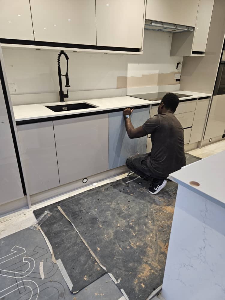 Continuing the transformation of Mr. Lekan’s home, we designed and installed a fully bespoke kitchen cabinet system that combines clean modern lines with smart, space-efficient storage. The high-gloss white cabinetry, integrated handles, and soft-close mechanisms create a seamless contemporary look, while the contrasting black fixtures add a refined, minimalist touch. This custom kitchen cabinet installation showcases Juvante Group’s expertise in delivering premium, functional, and beautifully crafted kitchen solutions for homeowners in Chelmsford and across Essex.
