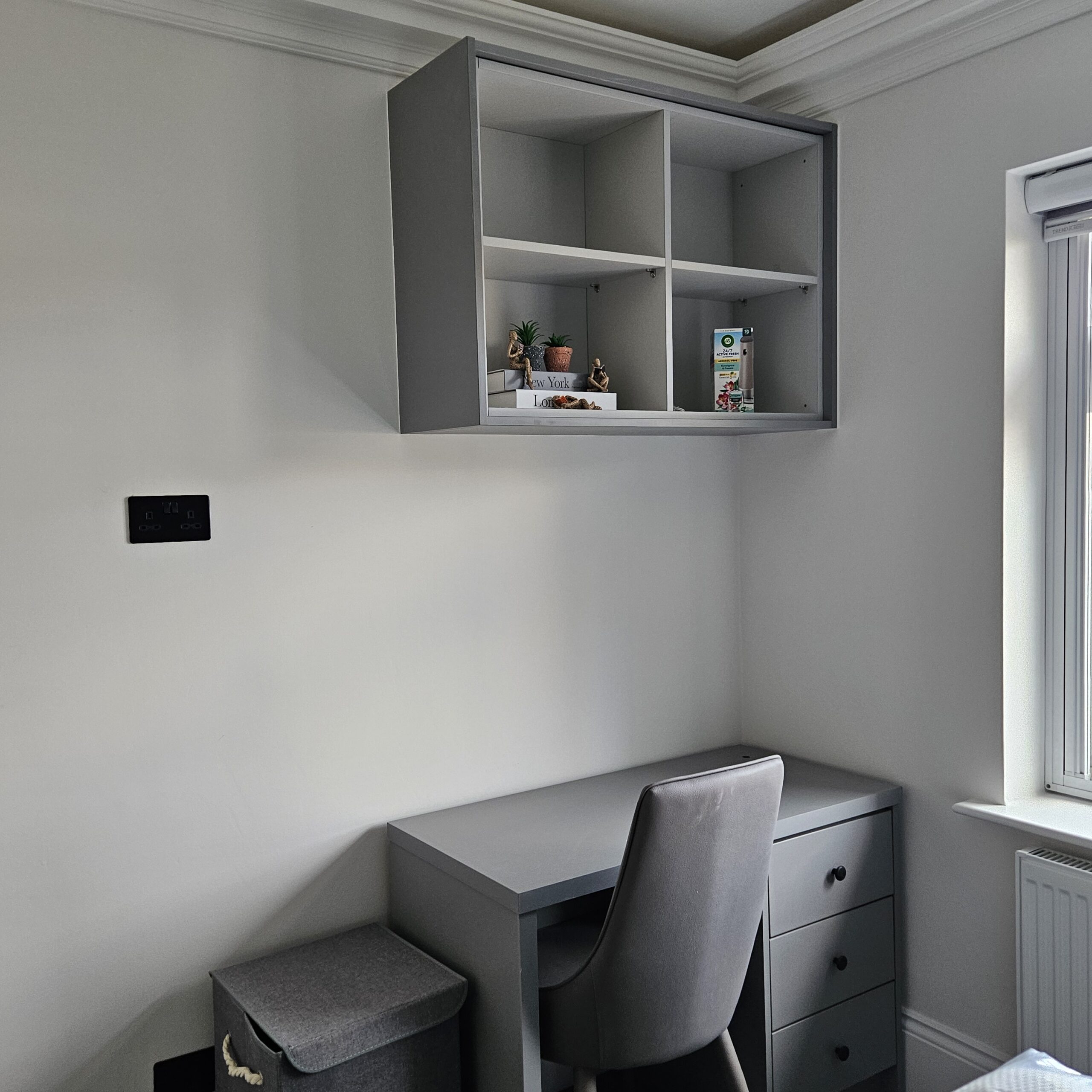 For the home office, we created a calm, efficient, and beautifully organised workspace tailored to Mrs. Osho’s daily needs. This bespoke home office features custom cabinetry, floating shelves, a spacious work desk, and smart storage solutions that keep everything tidy and within reach. With its clean lines and modern aesthetic, this setup enhances productivity while adding elegance to the room. It perfectly reflects our expertise in bespoke home office design, custom study furniture, and home office solutions crafted for comfort and functionality.
